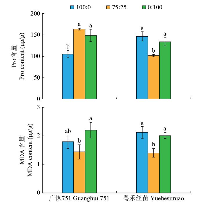 如图2可知,与100:0处理相比,75:25和0:100处理的广恢751叶片Pro含量分别增加了55.67%和41.32%,粤禾丝苗叶片Pro含量分别下降了44.34%和9.62%。75:25和0:100处理广恢751叶片MDA含量均与100:0处理无明显差异。与100:0处理相比,75:25处理粤禾丝苗叶片MDA含量下降了33.84%,差异达显著水平(P<0.05),但0:100处理和100:0处理无显著差异。