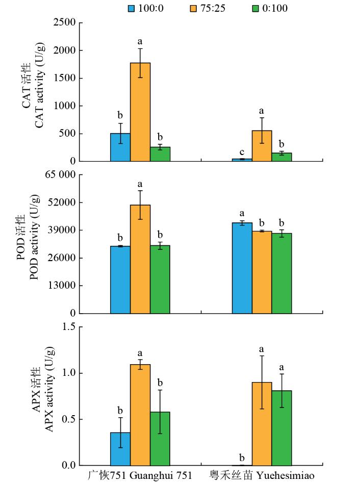 如图3可知,与100:0处理相比,75:25处理下广恢751叶片的CAT、POD和APX活性分别增加了250.00%、61.42%和207.00%,差异达到显著水平(P<0.05),但0:100处理无显著差异。与100:0处理相比,75:25处理粤禾丝苗叶片CAT和APX活性显著增加,差异均达到显著水平(P<0.05)。