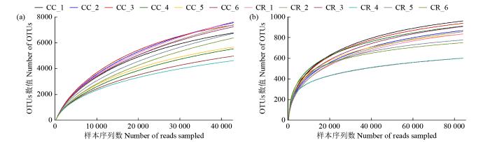 相似度97%水平下不同处理土壤细菌(a)和真菌(b)的稀释曲线