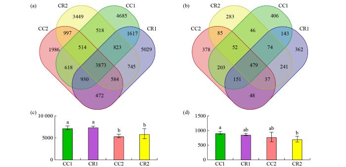 就真菌(图4b和表3)而言,子囊菌门(Ascomycota)为绝对优势菌门,占总OTU的68.50%~88.25%。其他平均丰度>1%的包括担子菌门(Basidiomycota)、被孢霉门(Mortierellomycota)、虫霉门(Entomophthoromycota)、壶菌门(Chytridiomycota)和球囊菌门(Glomeromycota)。子囊菌门(Ascomycota)在各处理之间表现出CR1>CR2>CC1>CC2,占比依次为88.25%、79.03%、73.61%和68.50%。担子菌门占总OTU的9.02%~ 25.42%,各处理之间表现为CC2>CC1>CR2>CR1,占比依次为25.42%、22.54%、11.43%和9.02%。综上所述,与CC处理相比,CR处理增加了子囊菌门的丰度,但降低了土壤中担子菌门的富集。