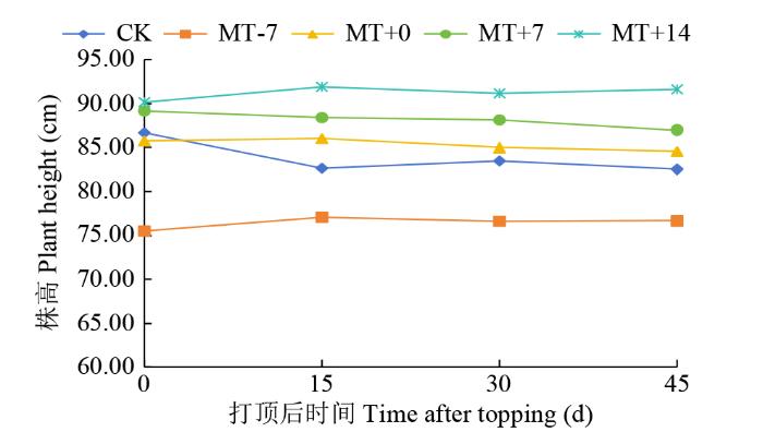 试验设置人工打顶和机械打顶2个因素。人工打顶时间为7月15日(CK),机械打顶时间分别为7月8日(MT-7)、7月15日(MT+0)、7月22日(MT+7)和7月29日(MT+14),共5个处理。机械打顶采用人工手持充电式小手剪(TOMSPOWER)模拟操作,打顶高度为5~10 cm,平均高度为8.15 cm。采用随机区组设计,小区长7 m,宽6 m,面积42 m2,3次重复。4月16日小区撒施复合肥(N、P2O5、K2O质量分数分别为15%、13%、17%)750 kg/hm2,并灌底墒水,灌水量为1200 m3/hm2;4月24日用微耕机旋耕,所有小区耙耱。4月25日播种,采用地膜覆盖,76 cm等行距种植,留苗密度为10.5万株/hm2,10月30日收获。田间管理措施同当地大田。