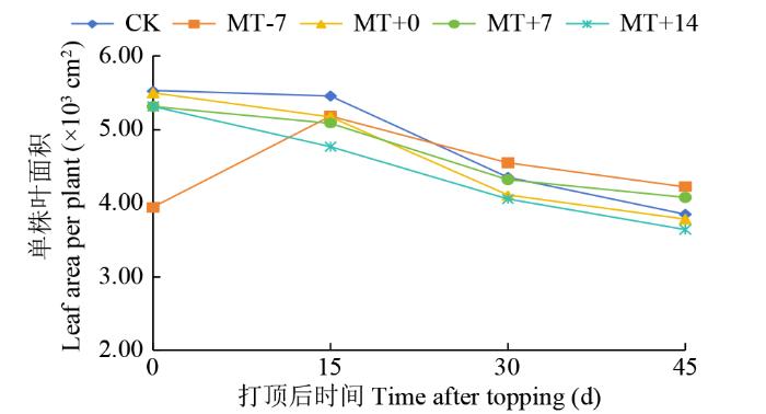如图2所示,打顶后,与CK相比,MT+0、MT+7和MT+14处理棉花单株叶面积没有明显变化;随着打顶后时间的推移,棉花单株叶面积变化趋势相似,均逐渐降低。打顶后0 d,MT-7与各处理相比,叶面积最低,随着打顶后时间的推移,各处理间棉花单株叶面积没有明显变化。