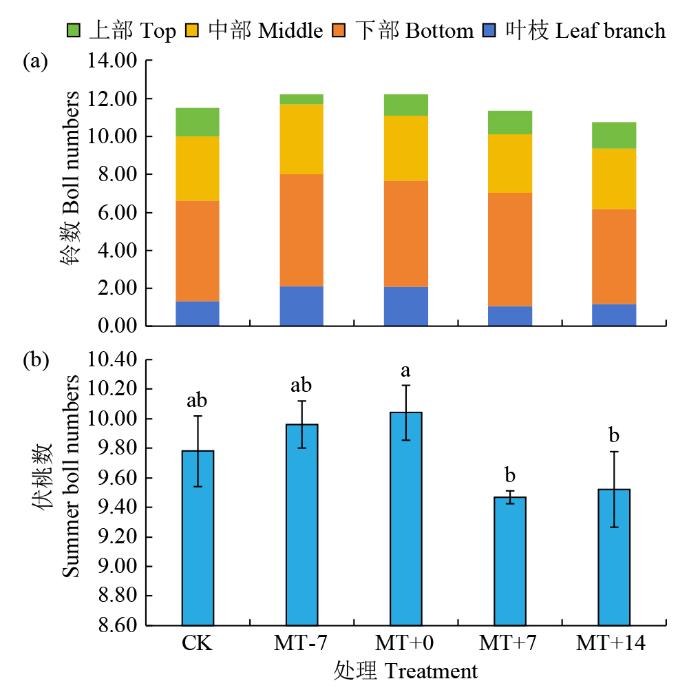 如图5a所示,与CK相比,MT-7和MT+0处理叶枝的铃数分别明显增加60.15%和55.64%,MT-7、MT+0和MT+7处理下部果枝的铃数分别增加11.39%、6.26%和13.28%,MT-7、MT+0、MT+7处理上部果枝的铃数分别减少64.67%、26.67%和15.33%。随着打顶时间的推迟,机械打顶处理MT-7、MT+0、MT+7和MT+14叶枝和下部果枝总铃数百分比分别为65.57%、62.84%、61.88%和57.28%,随着时间的推移而降低;上部果枝铃数百分比分别为4.37%、9.02%、11.14%和13.00%,随着时间的推移而增加。如图5b所示,打顶时间推迟影响棉花伏桃数,MT+7和MT+14处理的伏桃数比MT+0处理分别下降5.71%和5.18%,均达到显著水平。说明与人工打顶相比,机械打顶改变了棉铃的数量和分布,机械打顶时间也影响了棉铃在果枝上的分布。