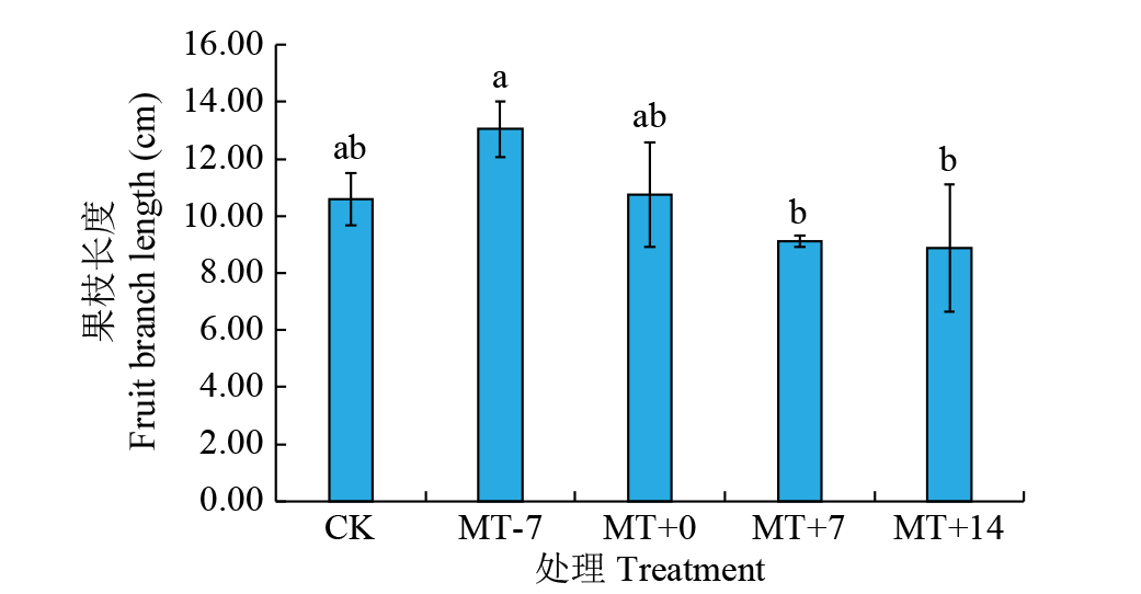 | Fig.3 Effects of different treatments on the length of upper fruit branches in cotton Different lowercase letters indicate significant differences at the P < 0.05 level. The same below. |