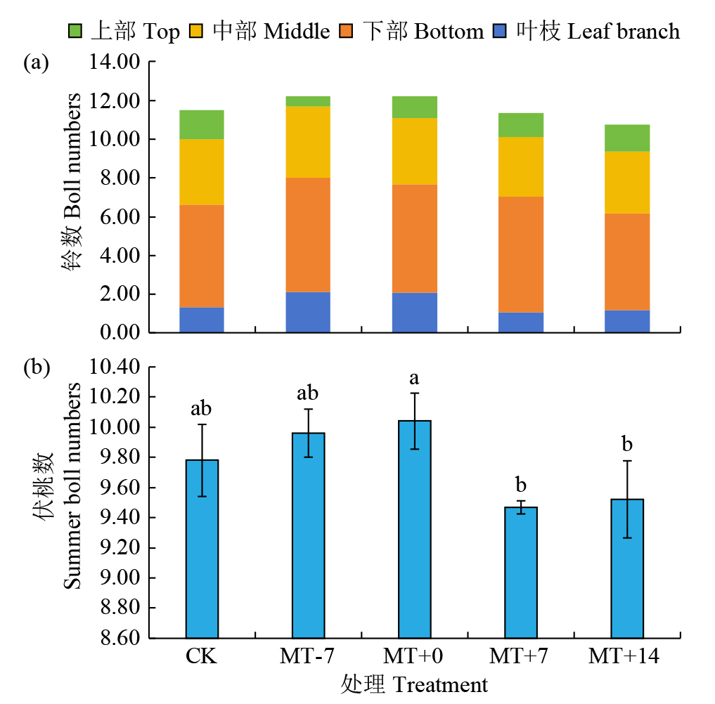 | Fig.5 Effects of different treatments on spatial-temporal distribution of cotton bolls and summer boll numbers |