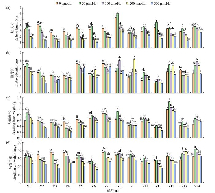 | 编号 ID | 镉浓度 Cd concentration (μmol/L) | 发芽率 Germination rate (%) | 发芽势 Germination potential (%) | 发芽指数 Germination index | 活力指数 Vigor index | |