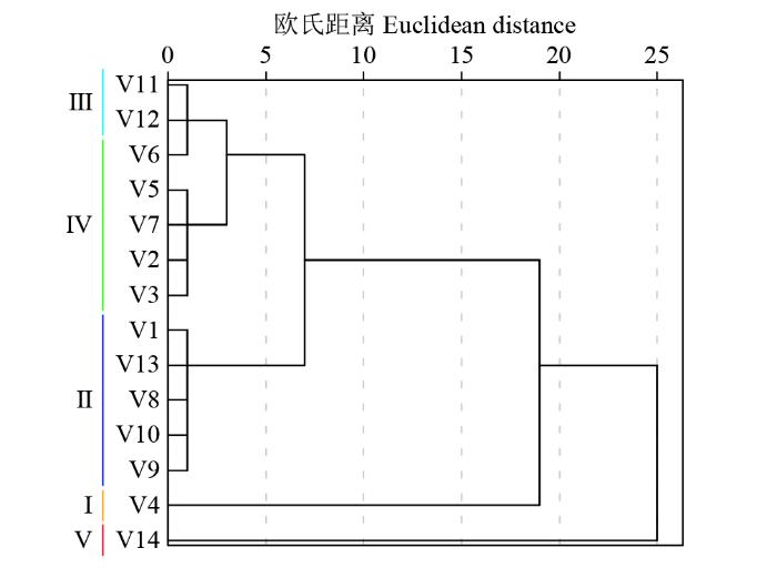 按照公式(4)计算可得到各苦荞种质的耐镉性综合评价值D,并根据D值大小对所有材料进行排序(表5)。结果表明,V14的D值最大,为0.88,说明其耐镉性最强,V4的D值最小,为0.06,即其耐镉性最弱。依据D值对其进行聚类分析发现,14份苦荞种质在欧氏距离2.0处可划分为5类(图2),其中,V4为第Ⅰ类,其D值最大,属强耐镉型;V1、V8、V9、V10和V13为第Ⅱ类,占供试材料的35.71%,为较耐镉型;V11和V12为第Ⅲ类,其D值居中,属于中间型;V2、V3、V5、V6和V7为第Ⅳ类,占供试材料的35.71%,属镉敏感型;V14为第Ⅴ类,其D值最小,是强镉敏感型。综上所述,14份苦荞材料中,有6份属于耐镉型,6份属于镉敏感型,2份为中间型。