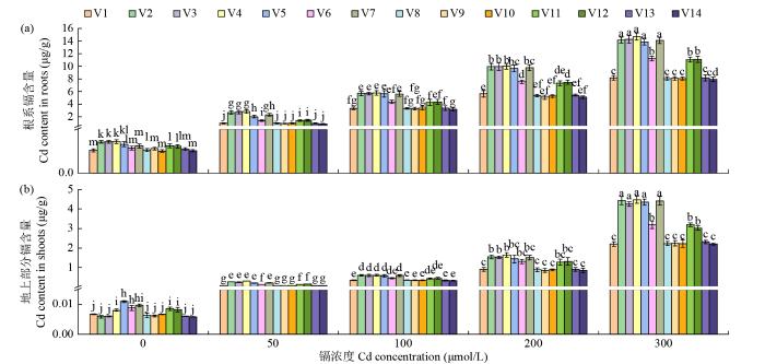 由图3可知,随着镉浓度的增加,苦荞根系和地上部分的镉含量增加;在相同镉浓度下,根系中的镉含量显著高于地上部分,说明苦荞根系对镉的积累和富集高于地上部分。在正常条件下,苦荞幼苗中仍含有一定量的镉离子,其中根系为0.1004~0.1425 μg/g,地上部分为0.0058~0.0109 μg/g,表明苦荞种子在发芽前就已经含有镉元素,即该苦荞曾在含有重金属镉的土壤中种植,并将镉离子富集到种子中。当镉浓度为50~300 μmol/L时,苦荞根系镉含量分别为0.8934~2.8852、3.2029~5.7642、5.1092~10.0029和7.9336~14.7039 μg/g,地上部分镉含量分别为0.0653~0.2591、0.3244~0.6000、0.8455~1.6390和2.1963~4.4764 μg/g,总含量分别为对照的8.99~20.06、32.57~46.77、50.72~84.92和91.40~139.27倍。在这些镉浓度下,苦荞幼苗中镉的总含量明显超过国家标准(GB 2762-2017,杂粮不得超过0.1 mg/kg),因此,不宜长期将苦荞种植于镉污染的土壤中。同时,苦荞幼苗对镉的积累因品种不同而存在差异,其中,镉敏感型苦荞种质(V2、V3、V4、V5和V7)中镉含量显著高于耐镉型苦荞种质(V1、V8、V9、V10、V13和V14)。