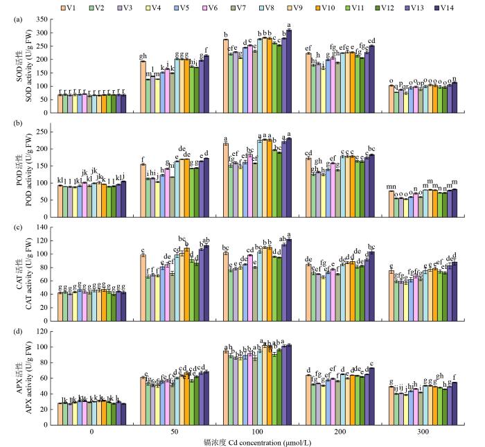 待消毒后的种子发芽并长至主根长3 cm左右时,将其移栽到1/2 Hoagland营养液中,待植株长至两叶一心时,进行镉胁迫(1/2 Hoagland营养液+50、100、200、300 μmol/L CdCl2)处理,对照为1/2 Hoagland营养液。胁迫5 d后,每个处理选取长势一致的植株5株,用去离子水将根系清洗干净并用滤纸将表面的水分吸干,整株鲜样称重后分别测定其生理指标。用硫代巴比妥酸法测定丙二醛(MDA)含量,用羟胺氧化法测定超氧阴离子自由基(O2-. )含量,用氮蓝四唑法测定超氧化物歧化酶(SOD)活性,用愈创木酚法测定过氧化物酶(POD)活性,用紫外分光光度法测定过氧化氢酶(CAT)活性,用Nakano法检测抗坏血酸过氧化物酶(APX)活性[23]。