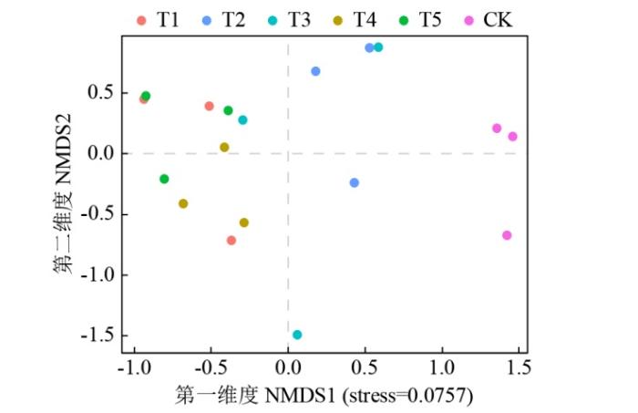 如图3所示,土壤真菌群落β多样性非度量多维尺度分析(NMDS)结果表明,轮作处理整体与CK处理距离较远,说明轮作与连作的土壤真菌群落结构存在明显差异。而T1、T4、T5与T2处理在第二维度有明显分离,表明不同作物轮作处理之间土壤真菌群落结构存在明显差异。