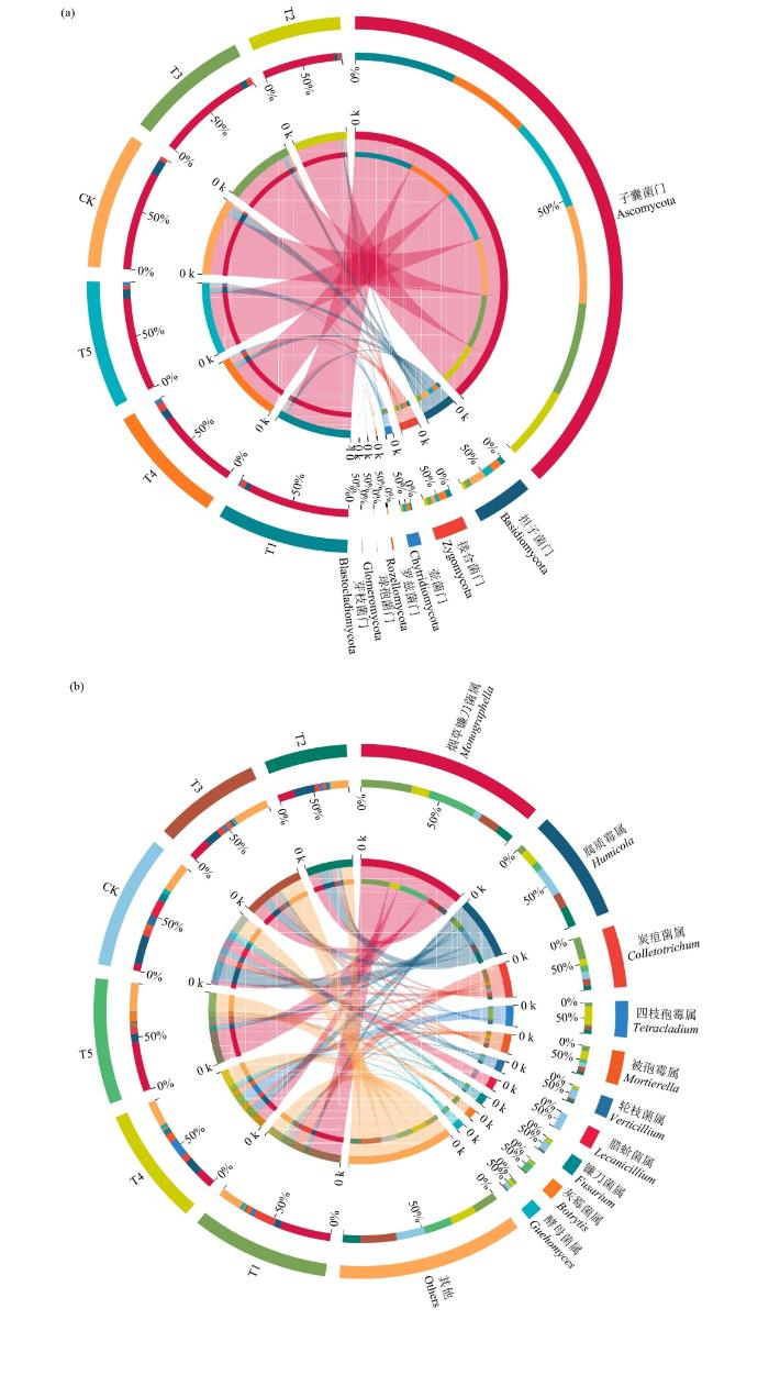 采用高通量测序技术研究了高寒黑土区不同轮作模式下土壤真菌群落结构特征,结果显示,6种处理根际土壤样品中共检测到真菌7门、22纲、72目、146科、300属和598种。各处理土壤优势真菌门中,子囊菌门相对丰度最大,其次是担子菌门和接合菌门。与CK相比,T3、T4处理会提高土壤真菌多样性和丰富度,其中T4根际土壤真菌多样性和丰富度最高;不同轮作模式间土壤真菌群落营养类型的相对丰度不同,T2、T3和T4处理以腐生营养型为主,其中T3中相对丰度最高,T1和T5处理则以病理营养型为主。