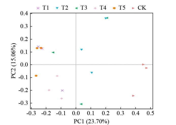对不同轮作处理的土壤微生物群落进行PCoA分析(图5),发现PC1和PC2对土壤真菌群落结构的解释度分别为23.70%和15.06%,T1、T4和T5处理分布相对集中,与T2和CK处理分布相对分散,同时T2和CK处理的分布相对集中;Anosim分析表明,不同处理之间土壤真菌群落组成存在差异。