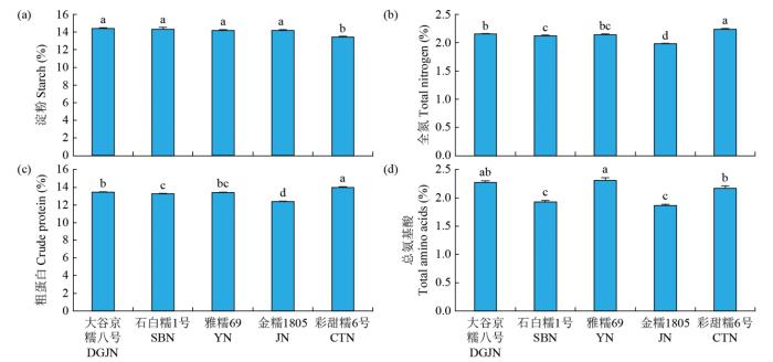 | 金糯1805 JN | 150.00±10.07ab | 10.95±0.30a | 11.07±0.16b | 58.10±3.73a | 9.97±0.36a |
