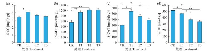 由图3可知,烤烟采烤结束时,T1和T2处理S-SC、S-ACP、S-CAT活性均高于CK处理,表明随着烤烟的生长不同程度上提高了土壤中S-SC、S-ACP、S-CAT活性。烤烟采烤结束时,T2处理根际土壤S-SC、S-CAT和S-UE活性均低于T1处理,S-ACR活性高于T1处理;T1处理S-CAT和S-UE活性显著高于T3处理根际土壤。结果表明烤烟与玉米套作后,一定程度上降低了部分土壤养分相关酶的活性,但是提高了磷养分利用相关的土壤酸性磷酸酶活性。