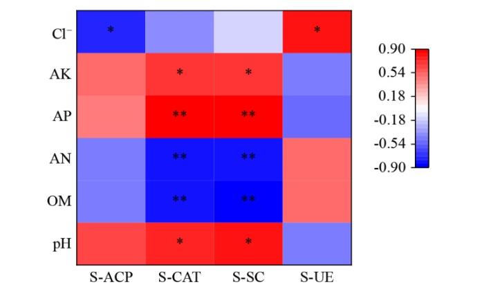 由图4可知,烤烟S-UE活性与Cl−含量有显著正相关关系;S-SC和S-CAT活性均与pH、速效钾、有效磷含量有显著正相关关系。烤烟根际土壤养分与酶活有7组呈显著正相关关系,有5组呈显著负相关关系。烤烟S-CAT和S-SC活性与土壤养分含量有10组显著或极显著相关,表明烤烟根际土壤中pH、有机质、碱解氮、有效磷、速效钾含量与S-CAT、S-SC活性关系较为密切。