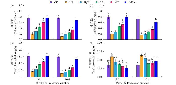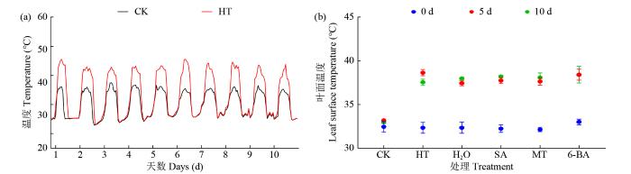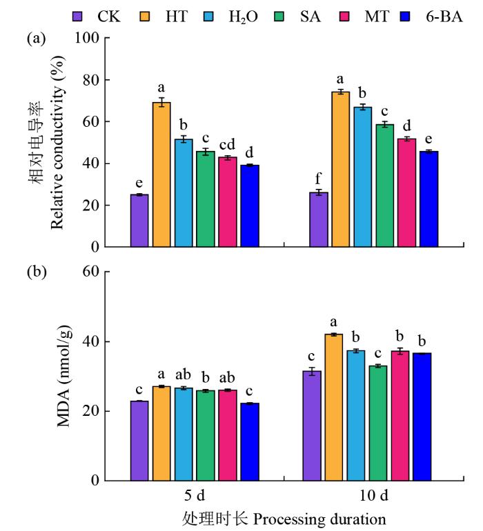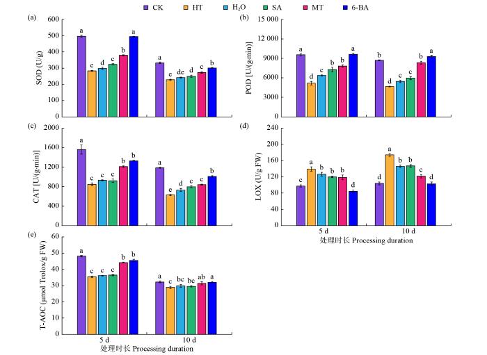 T-AOC指各种抗氧化物质和抗氧化酶构成的总抗氧化水平,可用于评价叶片活性物质的总抗氧化能力。高温胁迫下叶片的T-AOC值显著低于CK处理(图8e),在5 d时段,喷施MT和6-BA后高温胁迫叶片的T-AOC值较HT处理显著提高,分别提高了24.68%和28.43%;在10 d时段,喷施MT和6-BA叶片的T-AOC值与CK处理相比无显著性差异,较HT分别提高了8.65%和11.21%,其次是SA和H2O。
