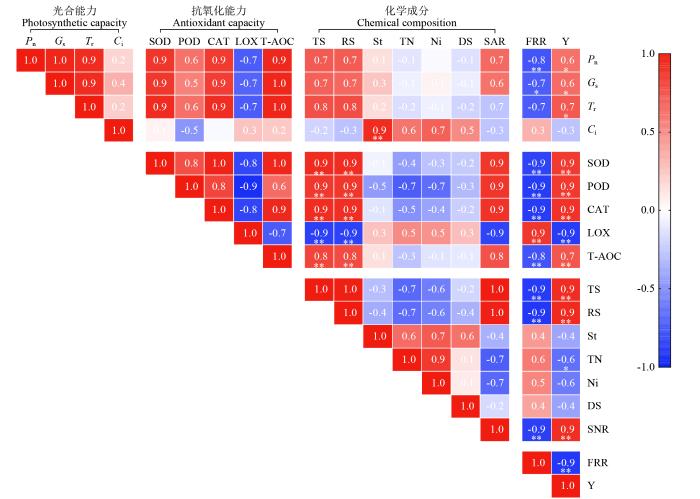 2.10 产量、逼熟率、光合参数以及抗氧化特性指标的相关性分析