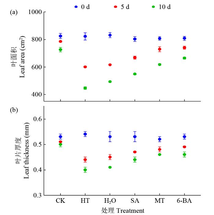 对于烤烟上部叶,外源喷施SA、MT和6-BA均不同程度缓解了高温胁迫引起的叶面积和叶片厚度的降低。在5 d时,喷施SA、MT和6-BA处理上部叶叶面积分别较HT处理明显升高了11.25%、21.49%和23.20%,叶片厚度分别明显提高了6.80%、9.10%和11.36%;在10 d,喷施SA、MT和6-BA处理上部叶叶面积分别较HT明显升高了22.83%、38.28%和48.75%,叶片厚度分别明显提高了10.00%、15.00%和15.00%,可见10 d各处理叶面积和叶片厚度增幅均高于5 d。这说明喷施外源物质在高温后期的缓解效果更好,其中以6-BA增幅较大,SA和MT处理次之。综上,成熟期高温胁迫使烤烟上部叶叶片萎缩,叶片厚度减少,而外源物质的应用可有效减少高温对其的不利影响。
