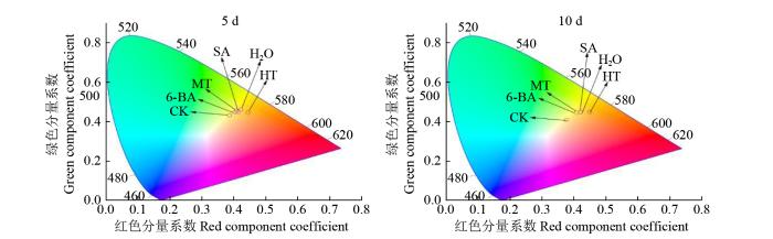 进一步将L*、a*和b*数据转换后绘制CIE1931色彩空间色度图(图4),结果显示,CK与HT处理的烟叶颜色特征在色度图上差异显著,坐标间距较大,与CK处理相比,HT处理颜色偏橘黄色。喷施不同外源物质的烟叶色度坐标均落于CK和HT处理之间,说明喷施外源物质后可不同程度地缓解高温对叶片衰老的负面影响,提高烟叶耐热性。其中,喷施6-BA和MT的烟叶色度坐标更接近于CK处理,说明二者具有较好的抗高温调控效果。