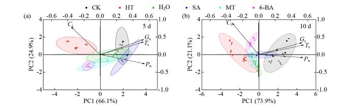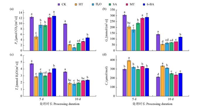 如图5所示,与CK相比,HT处理叶片Pn、Gs和Tr均显著降低,Ci显著提高,且10 d时变化幅度大于5 d时。