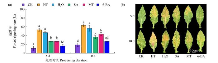 由图9可知,高温胁迫第5、10天,各处理烤烟上部叶高温逼熟率和烟叶落黄程度表现为CK<6-BA<MT<SA<H2O<HT,各外源物质处理上部叶逼熟率随高温胁迫时间增加呈加重趋势,但均显著低于HT处理。其中5 d时段,HT处理逼熟率较CK显著升高了380.00%,喷施SA、MT和6-BA后分别降低了49.94%、49.96%和68.74%;在10 d时段,HT处理较CK逼熟率显著高出235.26%,SA、MT和6-BA处理后上部叶逼熟率较HT处理分别降低了42.10%、31.58%和57.89%。