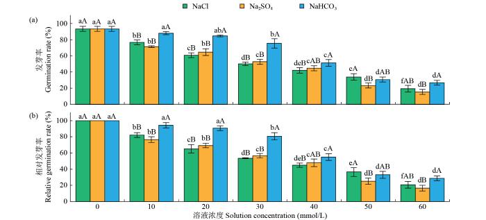 相对发芽率(%)=Nk/Nj×100,式中,Nk为不同浓度胁迫下种子发芽率,Nj为0 mmol/L(CK)浓度胁迫下种子发芽率;