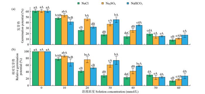 在不同中性盐(NaCl、Na2SO4)和碱性盐(NaHCO3)的胁迫下,异株荨麻种子的相对发芽率均随着盐浓度的升高而降低(图1b)。NaCl和Na2SO4溶液浓度≤30 mmol/L时,同一浓度下NaCl溶液胁迫的种子相对发芽率与Na2SO4溶液胁迫的种子相对发芽率无显著差异,均在50%以上;胁迫浓度≥40 mmol/L时,同一浓度下NaCl溶液胁迫的种子相对发芽率与Na2SO4溶液胁迫的种子相对发芽率有显著(P<0.05)差异;当NaCl和Na2SO4溶液浓度为60 mmol/L时,相对发芽率最低,分别为20.7%和16.5%;NaHCO3溶液浓度为60 mmol/L时,种子相对发芽率最低,为28.6%,并且同一浓度下,NaHCO3溶液胁迫的种子相对发芽率与NaCl和Na2SO4溶液胁迫的种子相对发芽率有显著(P<0.05)差异。