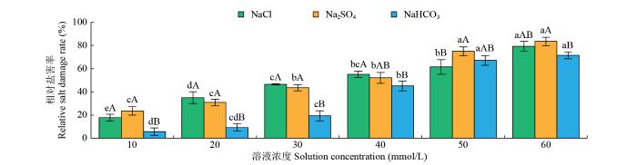 异株荨麻种子在不同浓度盐碱溶液下均受到不同程度的盐害,随着胁迫浓度的升高,相对盐害率逐渐增大(图4)。在中性盐处理下,NaCl和Na2SO4胁迫浓度为10 mmol/L时,种子相对盐害率均较低,分别为17.8%和23.5%,当胁迫达到60 mmol/L时,种子相对盐害率均最高,分别达79.3%和83.5%;在碱性盐处理下,NaHCO3胁迫浓度在10~40 mmol/L时,种子相对盐害率在5.6%~ 19.3%,当胁迫浓度≥50 mmol/L时,种子相对盐害率≥60%。在各浓度盐碱溶液处理下,NaCl和Na2SO4溶液处理下的种子相对盐害率均显著(P<0.05)高于NaHCO3溶液处理下的种子相对盐害率,说明中性盐对异株荨麻种子的盐害程度高于碱性盐。