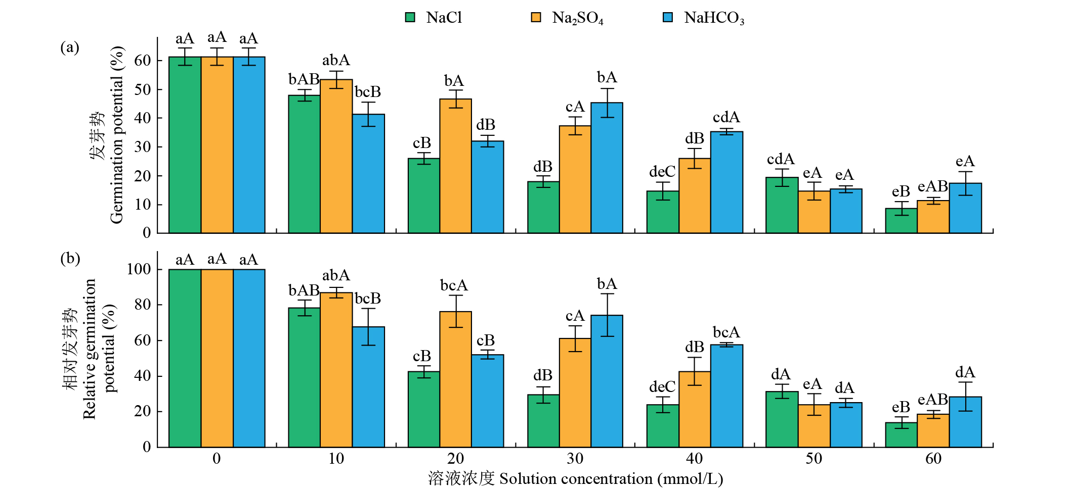 | 图2 盐碱胁迫对异株荨麻种子发芽势和相对发芽势的影响 |