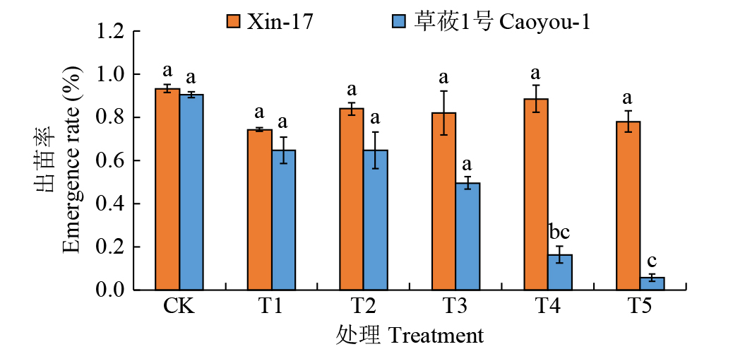 | 图1 复合盐碱胁迫下燕麦的出苗率 不同小写字母表示P < 0.05水平差异显著,下同。 |