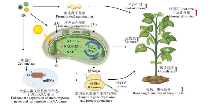 Nayeri等[42]证明,Ag/ZnO NPs在模拟全太阳光谱条件下,增强了小麦的光合作用和发育。Abbasifar等[43]研究表明,10 mg/kg、25 nm的铜纳米颗粒(Cu NPs)可使罗勒根鲜重增加25%,根干重增加30%;对罗勒叶片中叶绿素a、叶绿素b、总叶绿素和类胡萝卜素的浓度都有显著影响。鲁力[44]用2 mg/株的Mn3O4 NPs喷施生菜叶面,结果显示生菜的光合色素、糖、多酚含量和生物量显著增加并上调了一系列小分子抗氧化代谢产物的水平。Faizan等[45]用8 mg/L的ZnO NPs根部浸入处理30 min可以显著提高番茄植株的生长、光合速率和叶绿素含量,并改善抗氧化酶系统,加速脯氨酸积累。Wang等[46]发现,与大体积的铜颗粒相比,1 mg/kg的铜纳米团簇(Cu NCs)能显著增强番茄的抗氧化酶活性,提高番茄叶片光合速率、碳水化合物含量,并且减缓叶片老化。