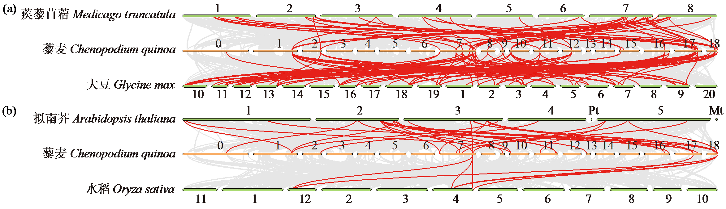 | 图5 藜麦与拟南芥、水稻、蒺藜苜蓿和大豆中LEA基因共线性分析 红线为LEA共线性基因对,灰线为其他基因的共线性。数字表示上述作物基因组的染色体数量。 |