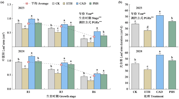 图1为LA和LAD对不同化控方式的响应,方差分析结果显示,年份对结果影响不显著,生育时期和调控方式对结果有极显著影响(P<0.001)。R1时期后LA逐渐下降,R1-R3时期及R3-R6时期LA分别平均下降10.88%和47.73%。与CK处理相比,ETH处理下玉米在R1时期的LA平均下降23.30%,CAD处理下则提高20.45%。PHS处理抵消了乙烯利在R1时期对LA的影响,并且在R6时期相较于CK处理显著提高24.75%。不同化控方式改变了LA的大小和叶片衰老速率,进而改变了LAD。相较于CK处理,ETH处理的LAD平均降低了25.70%,而CAD处理平均提高了35.42%。PHS处理对LAD的影响在2年间不一致,2023年较CK处理显著提高了11.28%,2024年则无显著差异。