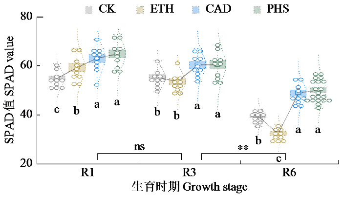 如图2所示,R1―R3时期玉米SPAD值下降不显著,而R3―R6时期各处理平均SPAD值显著下降了22.99%。不同化控方式影响玉米的SPAD值,在R1时期,喷施调节剂后SPAD值均显著提高;在R3时期,与CK处理相比,ETH处理的SPAD值无显著差异,而CAD和PHS处理则分别显著提高9.49%和9.53%;在R6时期,与CK处理相比,ETH处理的SPAD值降低了18.17%,CAD和PHS处理则分别提高了23.67%和26.55%。各时期下,CAD和PHS处理之间的SPAD值差异不显著,且均显著高于CK处理。