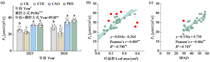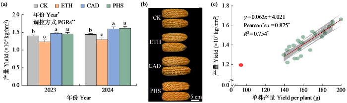 不同年份和化控方式均显著影响玉米的产量(图6a和图6b),根据产量构成因素(表2)发现,年份通过影响穗粒数改变产量。相比于2023年,2024年各处理的平均产量提高了8.07%。相较于CK处理,ETH处理的产量2年内平均下降了11.07%。CAD和PHS处理间无显著差异,相比于CK处理均显著增加,2年内分别平均提高了7.81%和7.76%。不同化控方式通过改变穗粒数和千粒重影响产量。与CK处理相比,ETH处理的穗粒数在2023年和2024年分别下降了7.90%和6.15%,千粒重则无显著差异;CAD处理在2023年穗粒数显著提高了7.56%,在2024年无显著差异,2年内千粒重平均提高了9.22%;PHS和CAD处理对穗粒数和千粒重的影响相似。不同化控方式改变了玉米的HI,相较于CK处理,ETH和PHS处理2年内分别平均增加了9.00%和6.00%,CAD处理则平均降低了9.00%。图6c表明玉米的群体产量与单株产量存在显著正相关关系,皮尔逊相关系数为0.875。