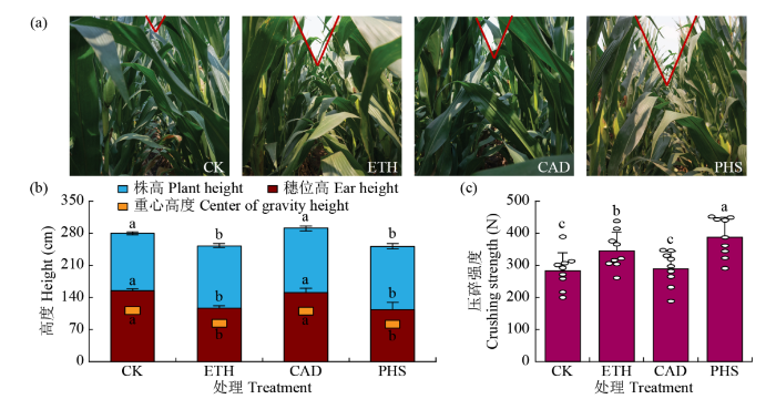于2024年R1期,在每小区选取连续的20株玉米,使用塔尺测量玉米的株高和穗位高,并于每小区沿地面取3株代表性植株,使用平衡法测量玉米的重心高度,使用茎秆强度仪(浙江托普云农科技股份有限公司,中国)测定基部第2、3和4节间的压碎强度。
