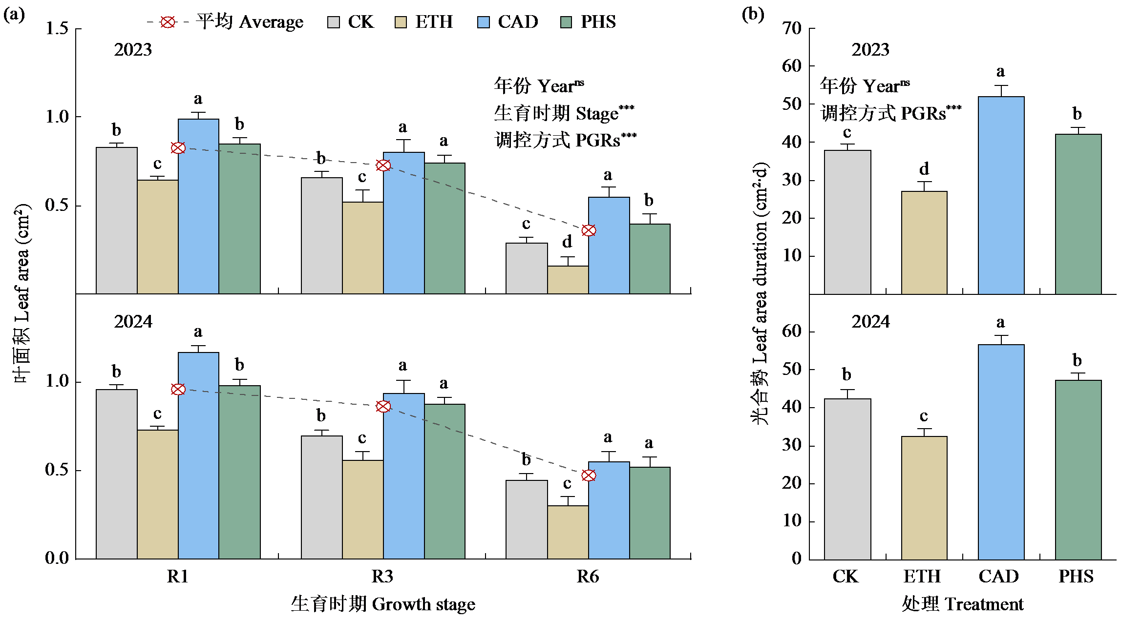 | 图1 不同化控方式对玉米叶面积和光合势的影响 不同小写字母表示在P < 0.05水平差异显著,“ns”和“***”分别表示不显著和在P < 0.001水平差异极显著。下同。 |