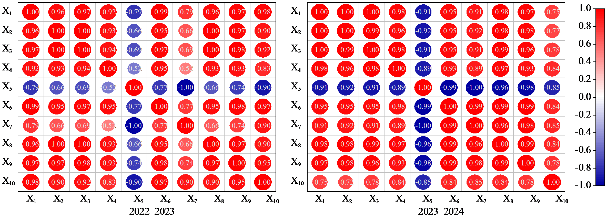 | Fig.5 Correlation analysis of winter wheat yield, dry matter accumulation and translocation and nitrogen nutrition indicators X1: yield; X2: nitrogen use efficiency; X3: aboveground dry matter accumulation at maturity; X4: pre-anthesis dry matter translocation amount; X5: contribution rate of pre-anthesis dry matter translocation to grain; X6: post-anthesis dry matter accumulation amount; X7: contribution rate of post-anthesis dry matter accumulation to grain; X8: aboveground nitrogen accumulation at maturity; X9: pre-anthesis nitrogen translocation amount; X10: post-anthesis nitrogen accumulation amount. |