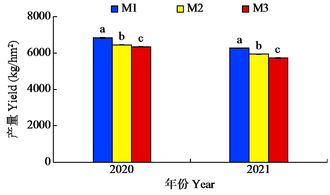| 图1 2020-2021年不同栽培模式对大麦产量的影响 不同小写字母表示达显著差异水平(P < 0.05),下同。 |