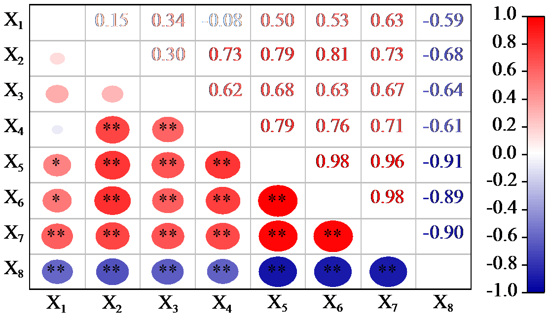 | Fig.11 Correlation analysis of yield and its components, leaf antioxidant enzyme activity and MDA content under different cultivation modes X1: 1000-grain weight; X2: spike number; X3: grains per spike; X4: yield; X5: SOD activity; X6: POD activity; X7: CAT activity; X8: MDA content.“*”indicates significant correlation at P < 0.05 level,“**”indicates extremely significant correlation at P < 0.01 level. The same below. |