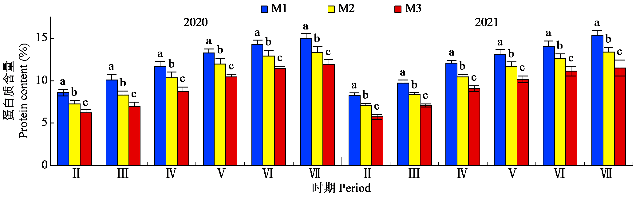| 图3 2020-2021年不同栽培模式下大麦籽粒蛋白质含量的动态变化 |