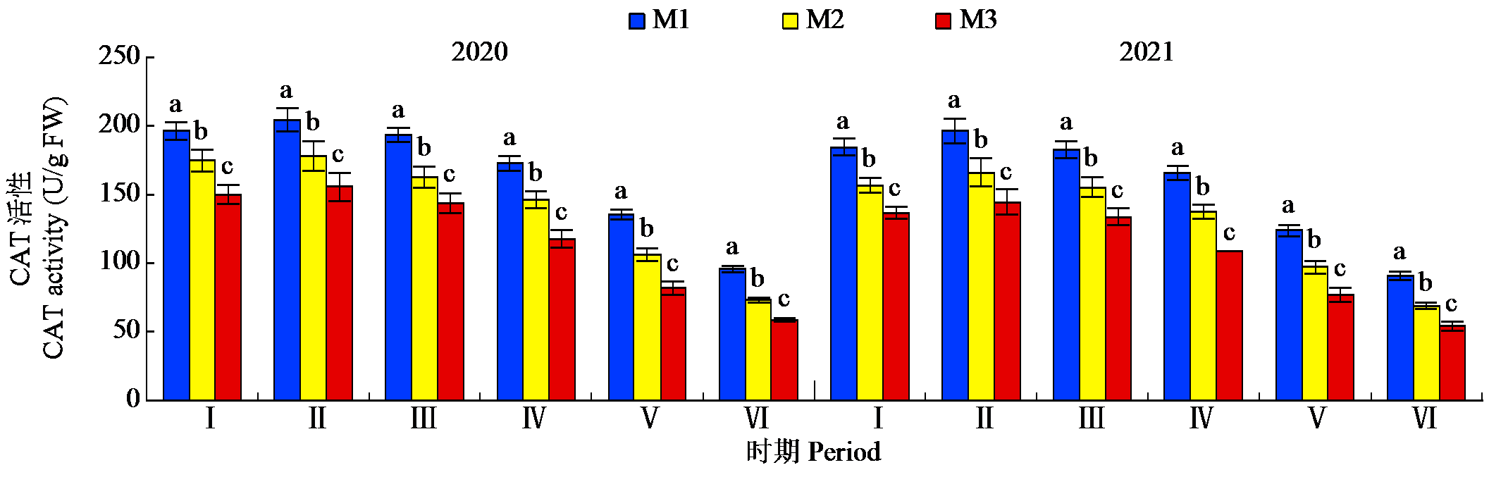 | 图6 2020-2021年不同栽培模式下大麦叶片CAT活性的动态变化 |