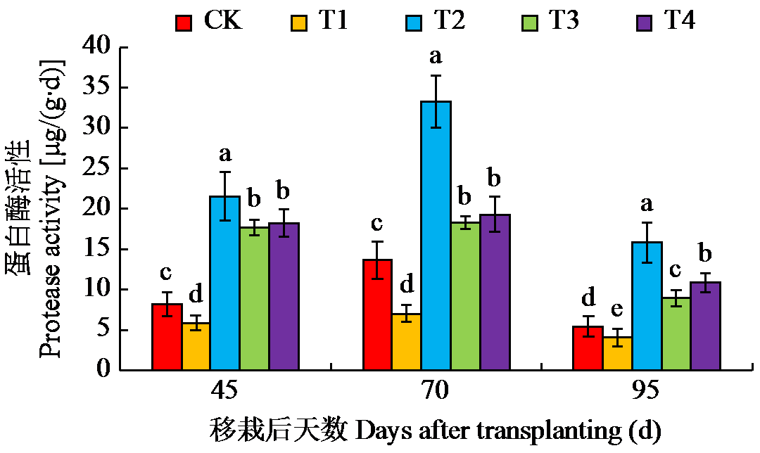 | Fig.1 Effects of chemical fertilizer reduction combined with organic fertilizer on soil protease activity Different lowercase letters indicate significant differences at P < 0.05 level, the same below. |