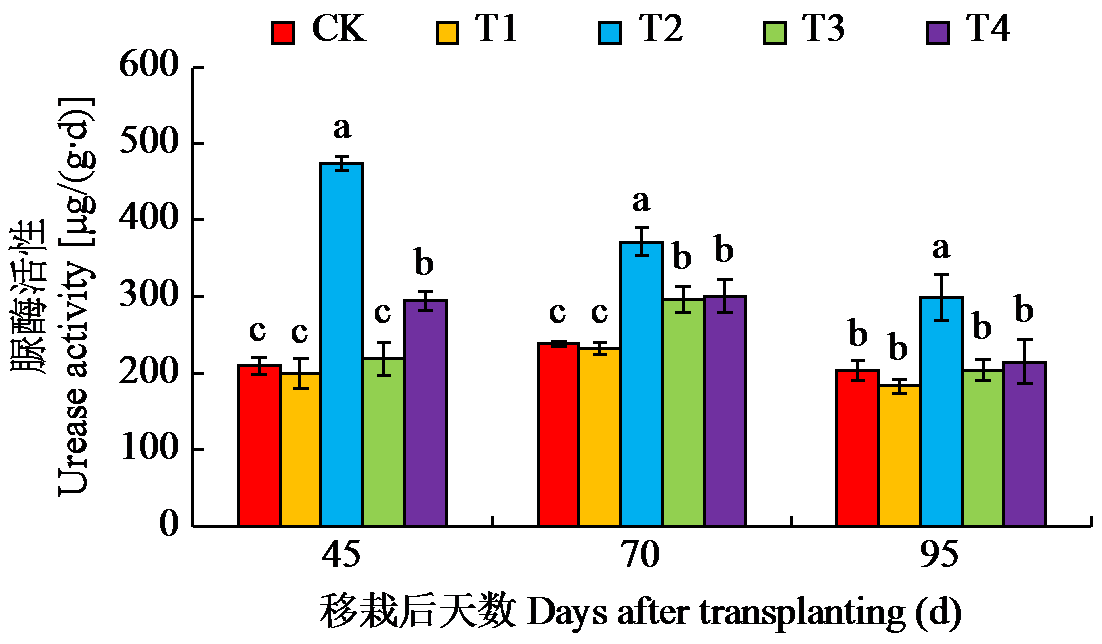 | Fig.5 Effects of chemical fertilizer reduction combined with organic fertilizer on soil urease activity |