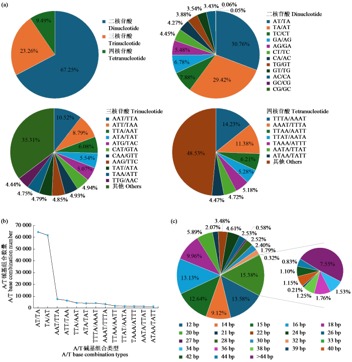 简单重复序列(simple sequence repeat,SSR)一般是由1~6个不等的碱基对串联重复而成的DNA序列,又称为微卫星DNA(microsatellite DNA)[6-