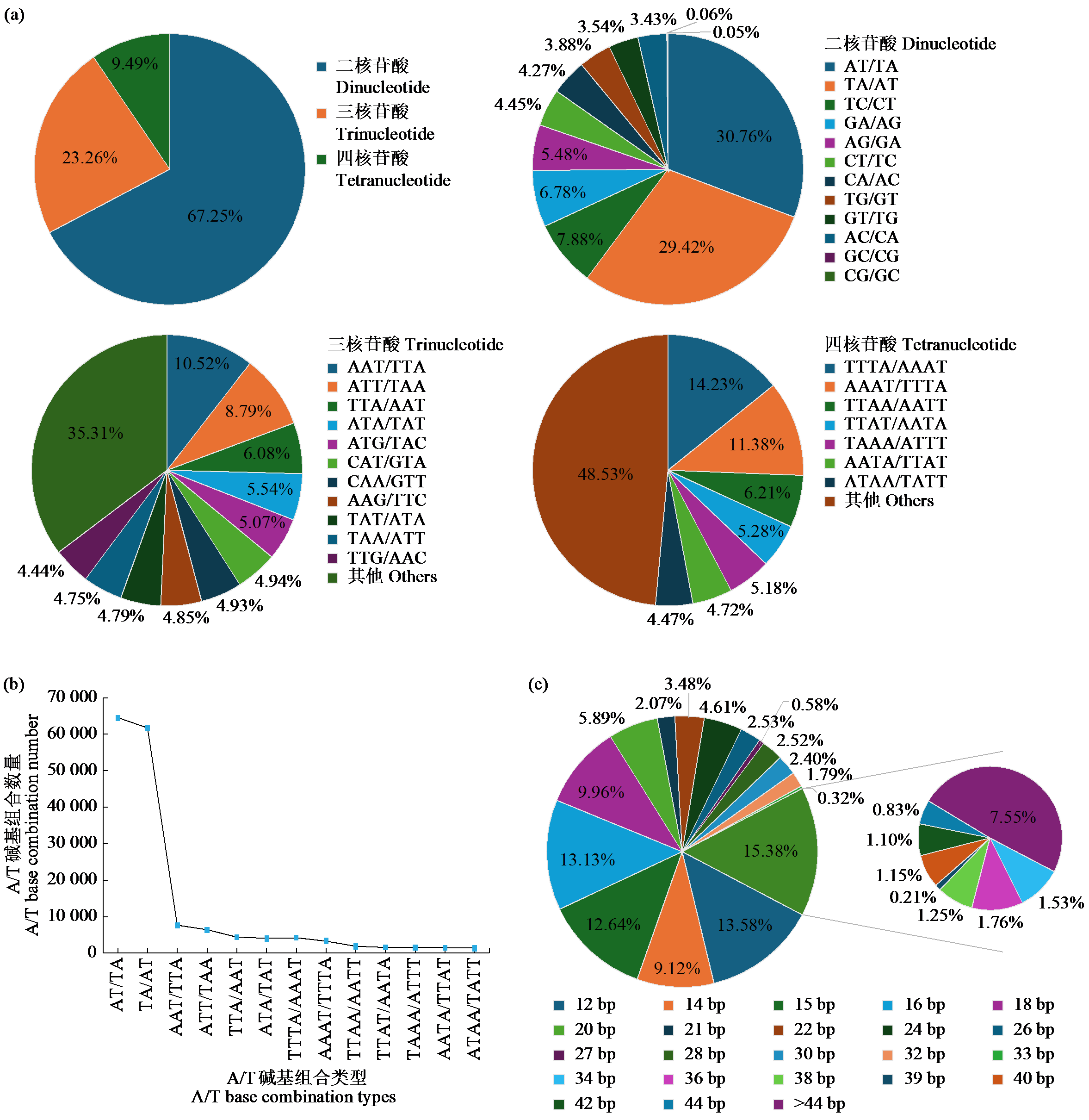 | Fig.1 Distribution characteristics of SSR locus repeat types in whole pea genome (a) the proportion of different types of repeat units in SSR locus, (b) the number distribution of SSR locus for different A/T base combination types, (c) SSR sequence length distribution. |