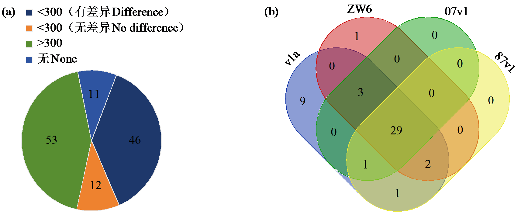 | Fig.2 Analysis of primers with amplification products in four pea genomes and amplification number of amplification products below 300 bp (a) The number of different amplified fragment sizes in four pea genomes, (b) Venn plots of amplification products below 300 bp in four pea genomes, ZW6: Zhongwan No.6. |
