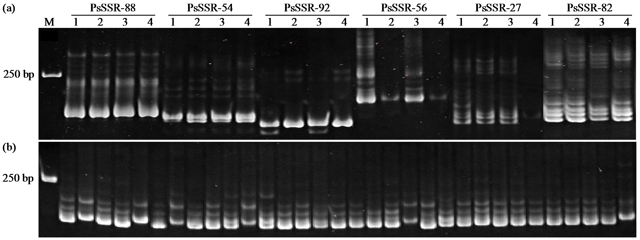 | 图4 部分SSR引物的PCR结果 (a) 部分SSR引物的PCR扩增产物,1:DWD05-01、2:成豌11号、3:方绿豌豆、4:杂粮甜豌豆。(b) PsSSR-82对32个豌豆品种的电泳检测结果。 |