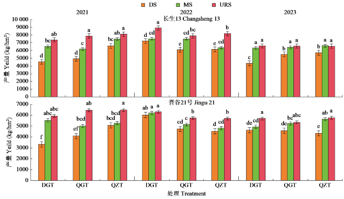 从图1可以看出,除2022年外,QZT处理在其余2年整体表现优于其他处理。2021年长生13完熟期QZT处理产量较DGT和QGT处理分别高231.49和740.78 kg/hm2;蜡熟期QZT处理较DGT处理高2060.29 kg/hm2;2021年晋谷21号完熟期QZT处理产量较DGT和QGT处理分别高555.59和23.15 kg/hm2,2023年完熟期QZT处理较DGT和QGT处理分别高59.53和416.69 kg/hm2,较蜡熟期QZT处理高1428.64 kg/hm2。且收获期越早,QZT处理(切穗直接脱粒)的产量涨幅越大。