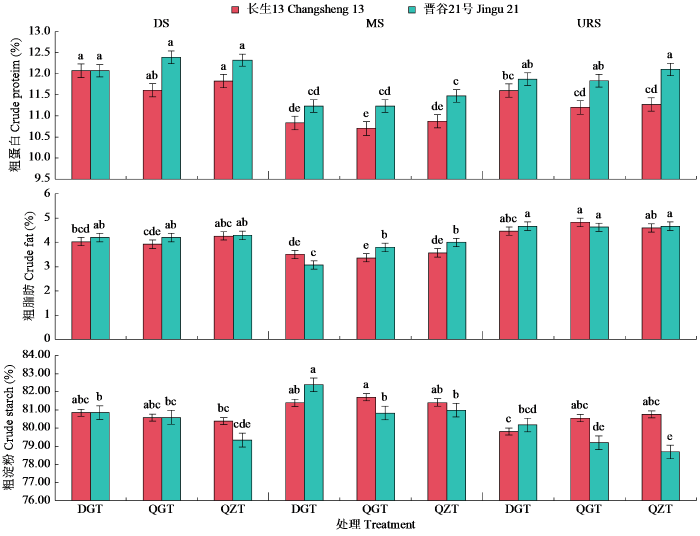 研究谷子淀粉的结构、物化特性及其功能特性,分析谷子淀粉与产品品质特性之间的关系,对于开发谷子新产品原料的选择、产品品质特性改善及新品种的培育提出指导意义[25]。长生13和晋谷21号2个品种从不同收获时间或不同收获方式看,粗淀粉变化存在显著差异。成熟期QGT处理下长生13粗淀粉含量最高为81.70%,相对于DGT、QZT处理分别高0.31%和0.29%;成熟期DGT处理下晋谷21号相对于QGT、QZT处理分别显著高1.55%和1.40%。长生13粗淀粉变幅小于晋谷21号,说明晋谷21号粗淀粉受环境等的变化更大。